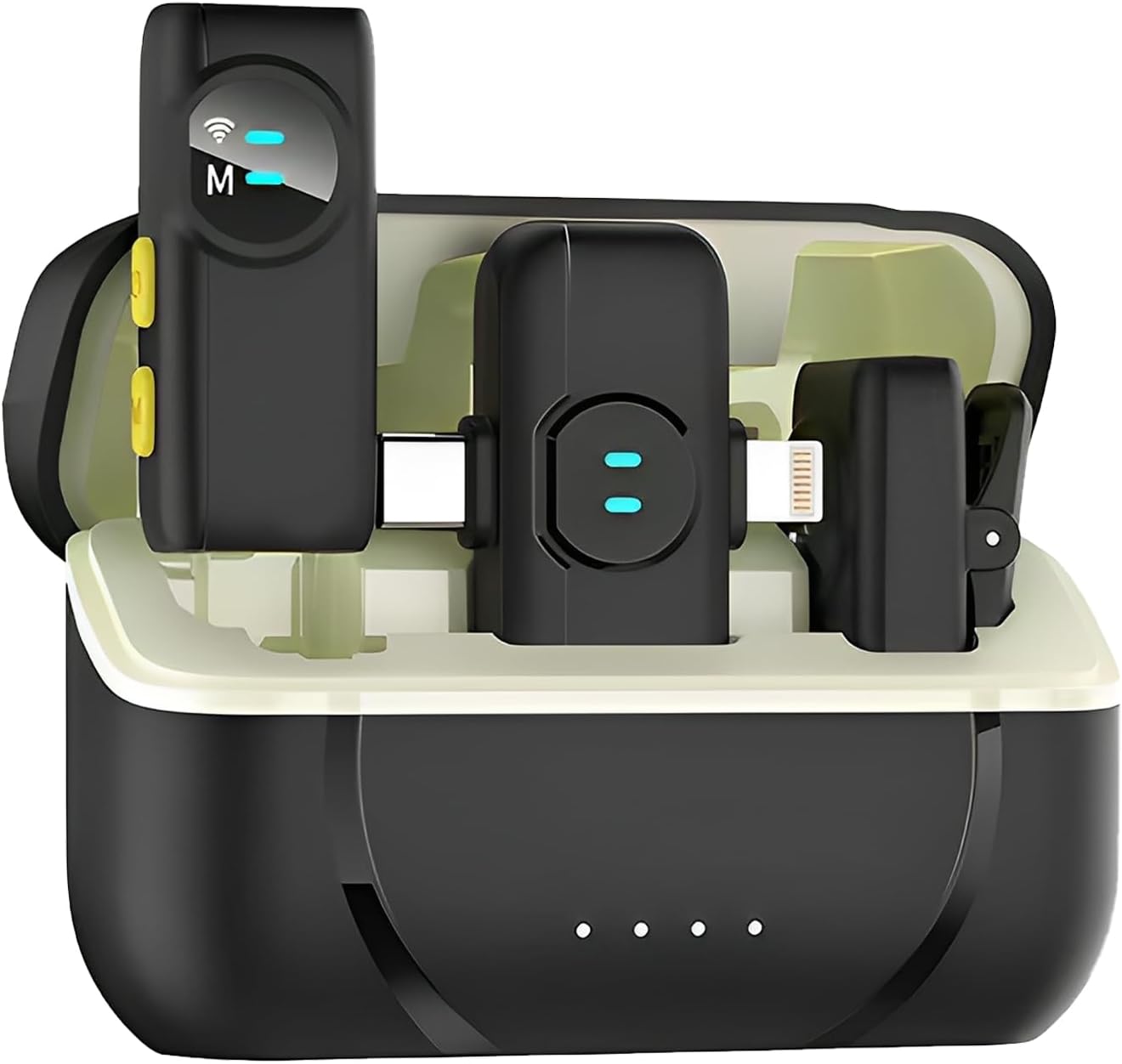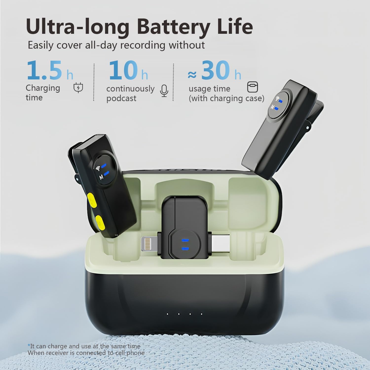 Dual wireless lavalier microphones with intelligent noise cancellation, wind muffs, and Lightning plug-and-play connectivity, ideal for iPhone vlogging and live streaming.