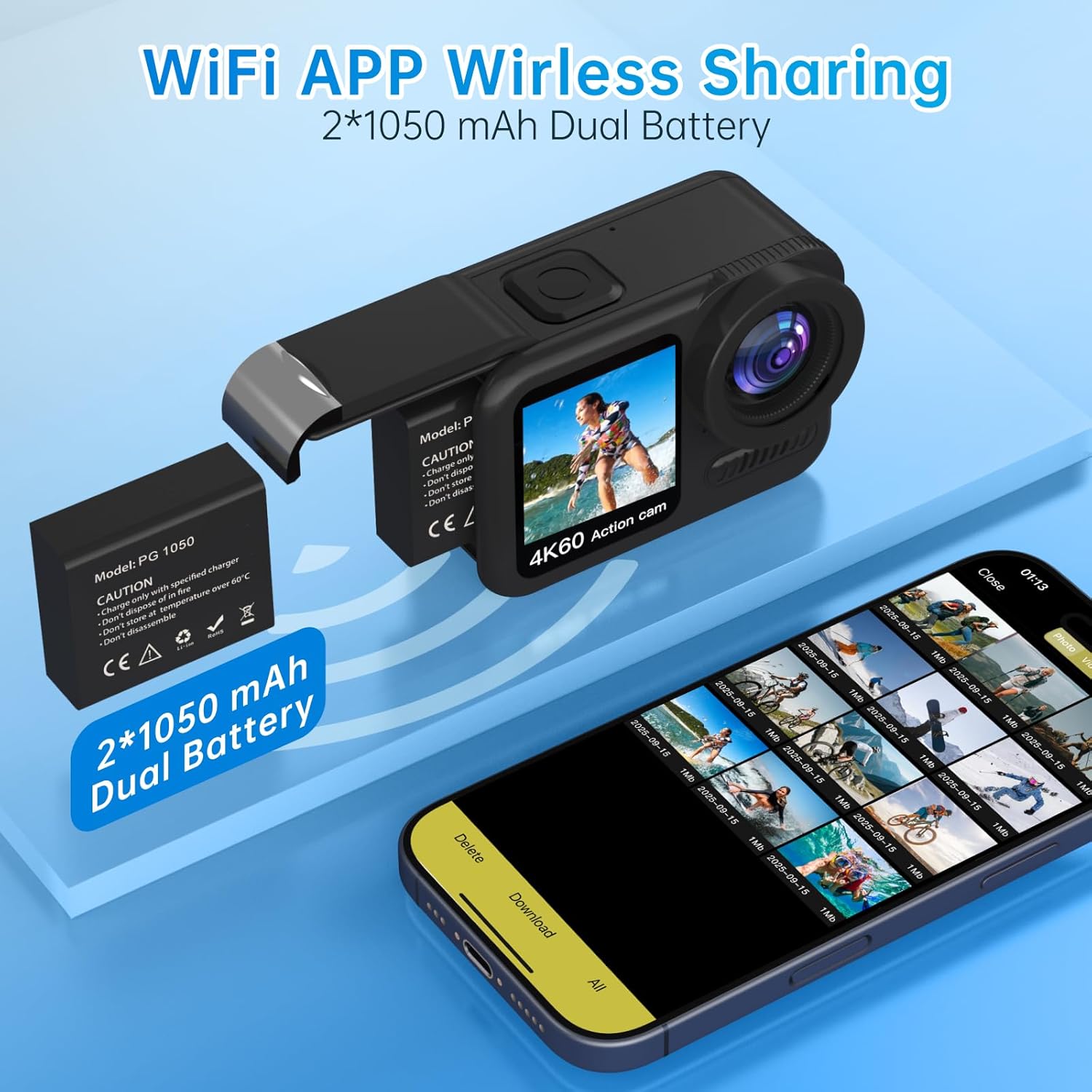 - Wireless Sports Camera with Dual Batteries:Stay connected via 2.8GHz WiFi and the Live DV app for instant sharing.Dual 1050mAh batteries deliver 200+ minutes of recording–perfect for extended motorcycle tours or underwater sessions. Note:Transfer footage via app before sharing