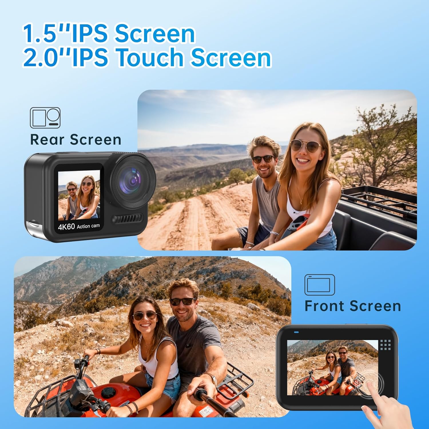 - Dual-Screen Action Camera with Touch Controls:Master your shots with a 2.0'' touchscreen and 1.5''IPS front;This helmet camera and bike camera hybrid allows quick parameter adjustments,selfie framing,and seamless mode switching.Includes a 32GB TF card (expandable to 128GB) for all-day recording on road trips or underwater expeditions
