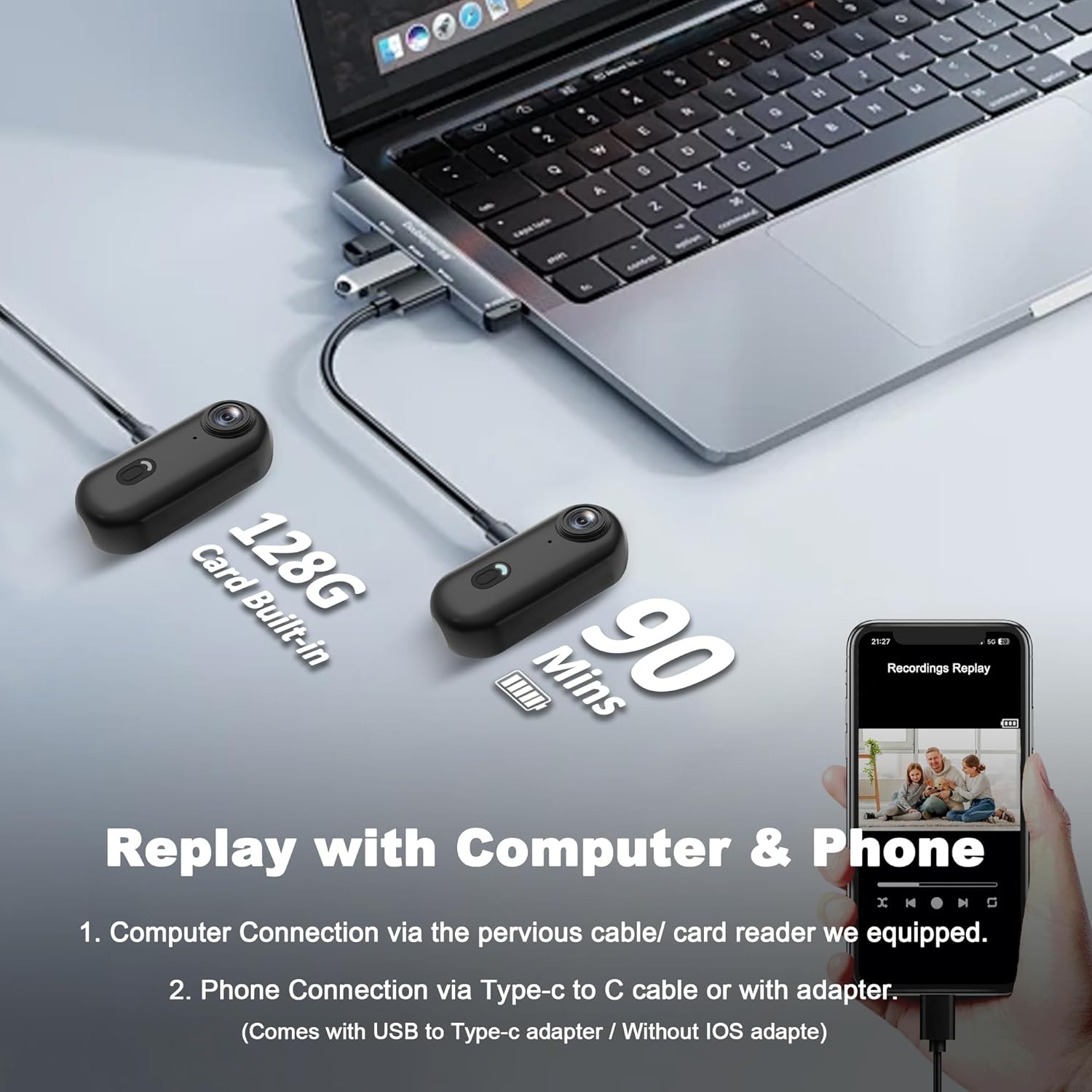 - 128GB Storage & Long-Lasting Battery Life - Enjoy ample storage with the built-in 128GB memory card, allowing up to 24 hours of H.264 footage. An additional external card slot provides flexibility, while the included card reader ensures easy data transfer. Powered by an 800mAh battery, the camera supports up to 90 minutes of continuous use, perfect for long recording sessions without the need for frequent recharges.